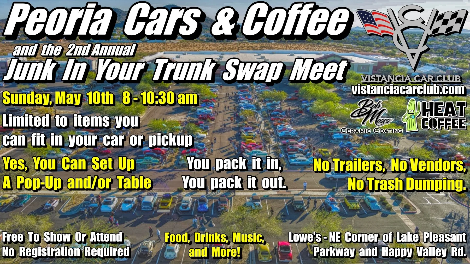 Have automotive parts, accessories, collectables, or memorabilia you want to get rid of? Our May edition of Peoria Cars & Coffee is also our 2nd annual "Junk In Your Trunk" swap meet. Get those garages cleaned out before summer. Guidelines on the flyer below.